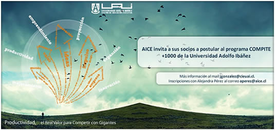 Como resultado final de la implementación de este programa se espera que la empresa sea capaz de potenciar sus recursos, generar empleo, obtener nuevas competencias, controlar el riesgo, consolidar ventajas competitivas y eliminar el estancamiento productivo. Más información al mail jgonzalez@cieuai.cl. Inscripciones con Alejandra Pérez al correo aperez@aice.cl |