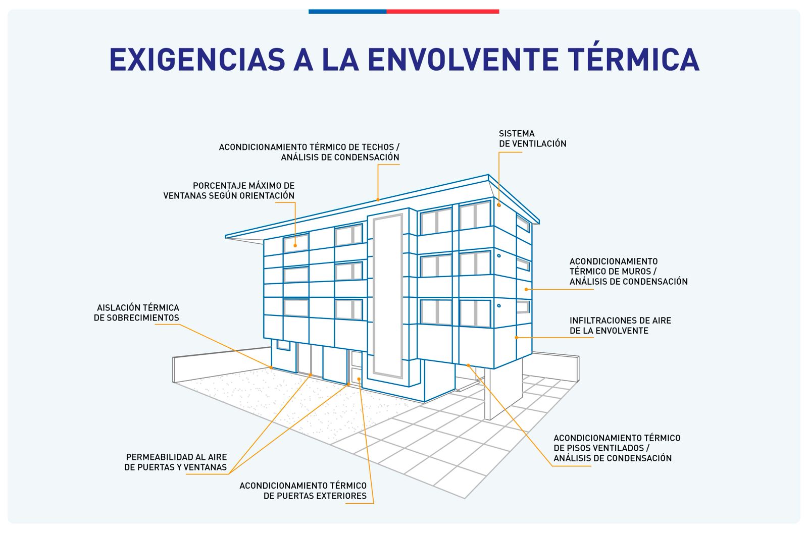 - Aumento de exigencias al comportamiento térmico: se aumentan las exigencias de comportamiento térmico a los techos, muros y pisos ventilados. Adicionalmente, se incorporan exigencias térmicas a puertas exteriores y sobrecimientos.
